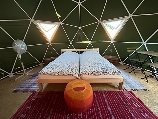 Glamping, which serves an audience with a special taste and sensitivity for Nature, consists of five Yurts, the well-known Mongolian Tents, with a wooden house and ecological dry toilets. There are also 5 Domes with private toilets. Right next to these Yurts is the big Geodesic Dome with views over the lake, for the events that take place regularly. Further ahead, the farm has 11 Bell Tents with ecological bathrooms, in a privileged space also with views over the lake.